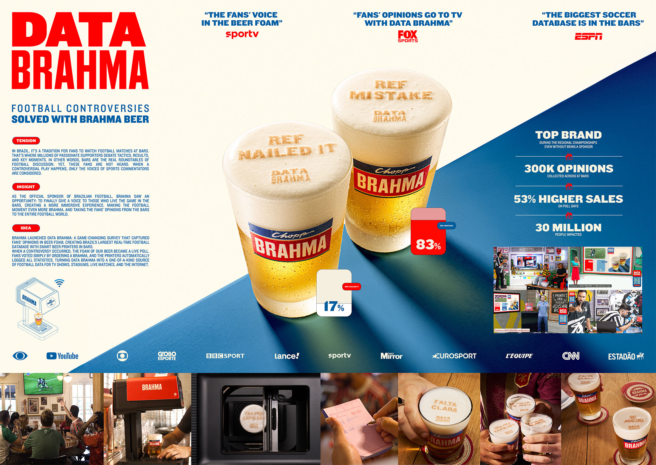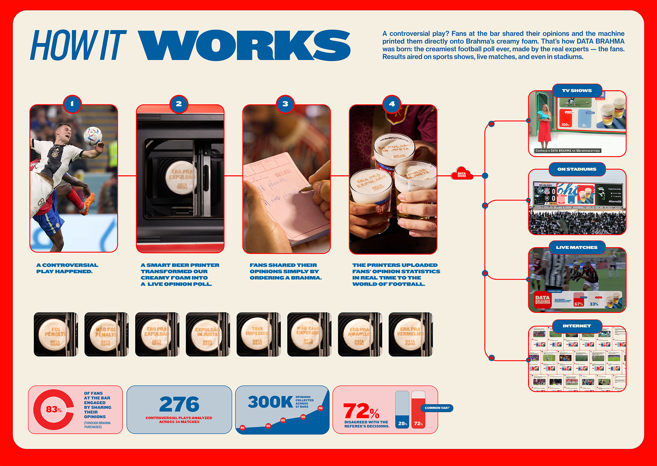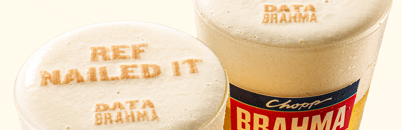 Brahma isn’t just a sponsor—it lives where football is truly felt: in bars, where opinions flow as freely as beer. Seeing bars as prime spots for debate, Brahma launched Data Brahma a campaign that turned beer foam into a voting platform. During controversial matches, drinkers voted by ordering a Brahma; their choices were printed live on the foam and broadcast on TV, in stadiums and digital channels.